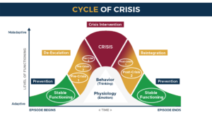 Depending on where an individual is along the Cycle of Crisis, these non-physical interventions will serve different functions. The tools are used as prevention strategies when an individual is in stable functioning, as de-escalation strategies when the individual is in pre-crisis, and as reintegration strategies during post-crisis.